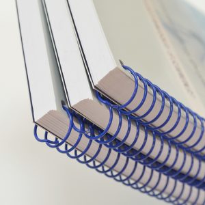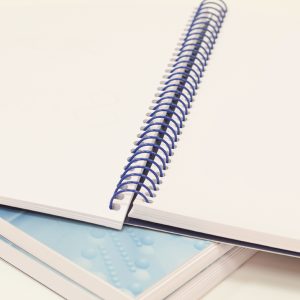 Tiene un acabado con gusanillo o alambre en el lateral, ya que la orientación de la libreta es vertical, de color azul combinando perfectamente con los colores corporativos y reafirmando la marca de la empresa. Libretas de publicidad con tu logo.
