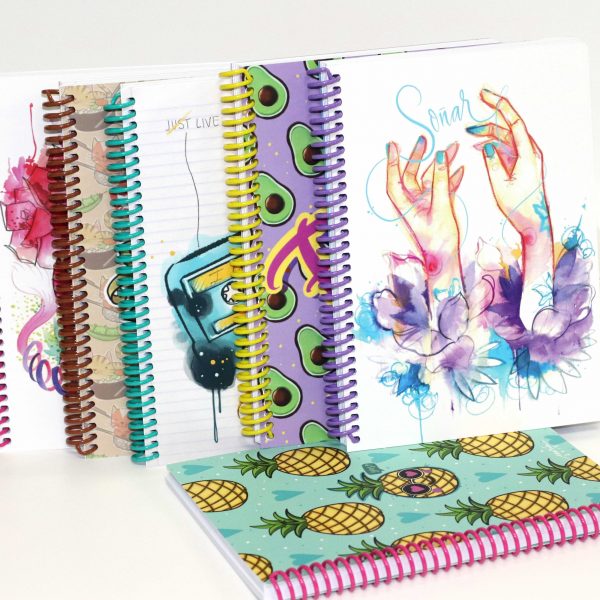 Las libretas hechas por Customizarte, consta de seis modelos diferentes con un diseño único, dibujadas cada una de ellas a mano por la tatuadora/ilustradora Maria Cabañas. Con una encuadernación con espiral de plástico de seis colores diferentes combinado con sus maravillosas portadas.